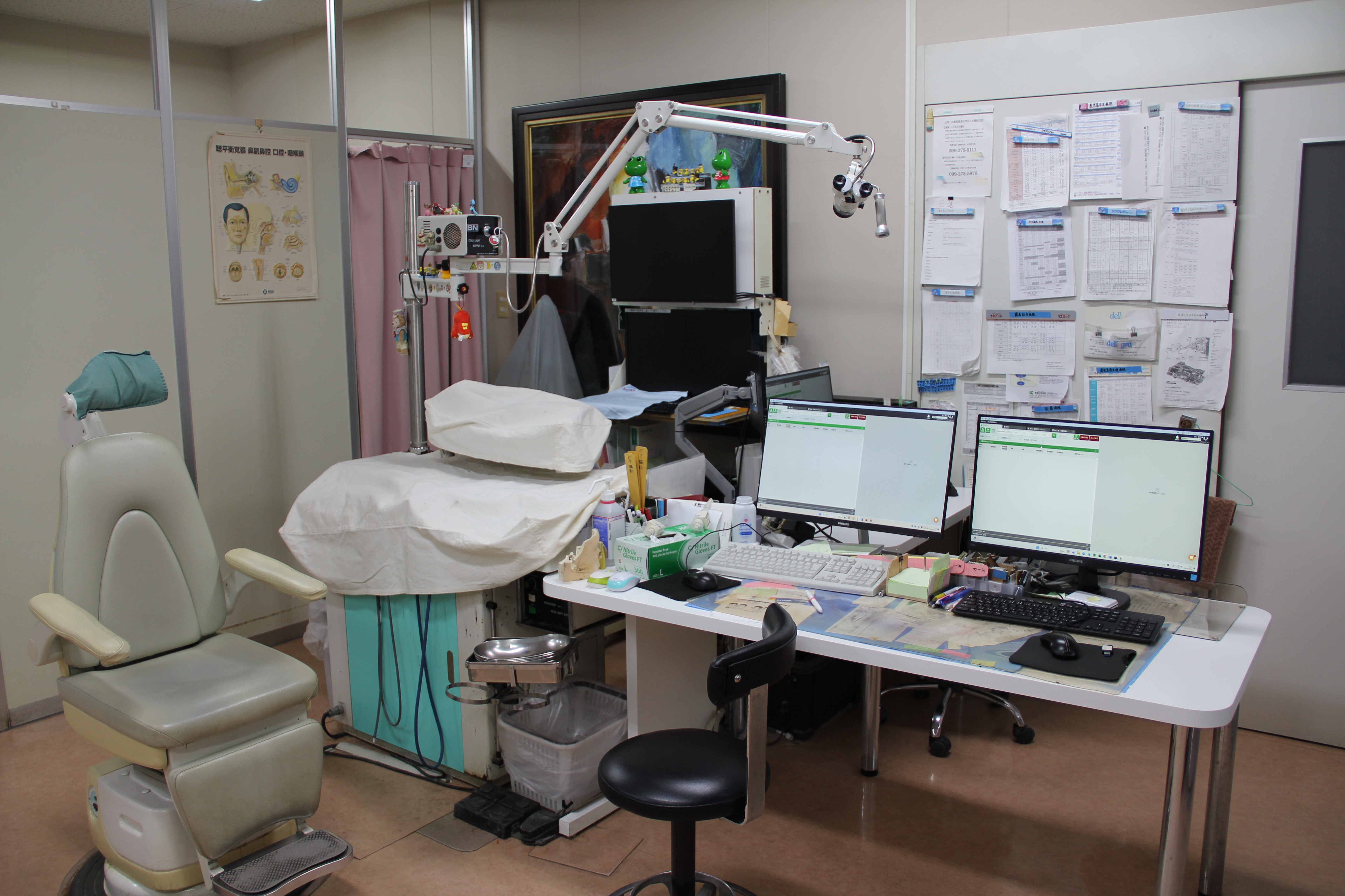 診察室では、耳・鼻・のどの状態を丁寧に確認し、必要に応じて検査を行います。 当院では、可能な限り患部の映像を患者さんご自身に見ていただきながら説明することを大切にしています。